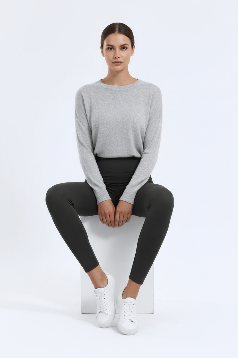 TeddySherpa™ Ultra-Cozy High-Rise Yoga Band Leggings in Charcoal, seated casual pose I