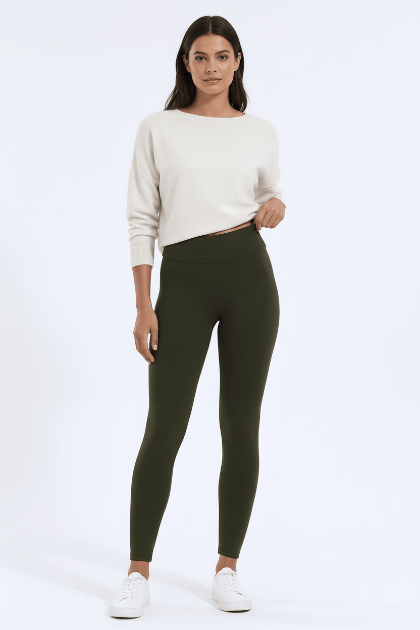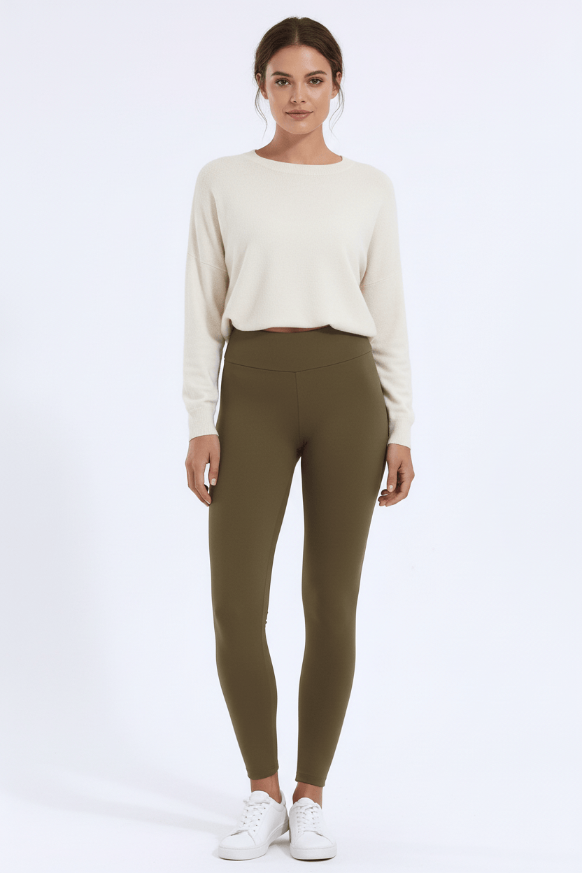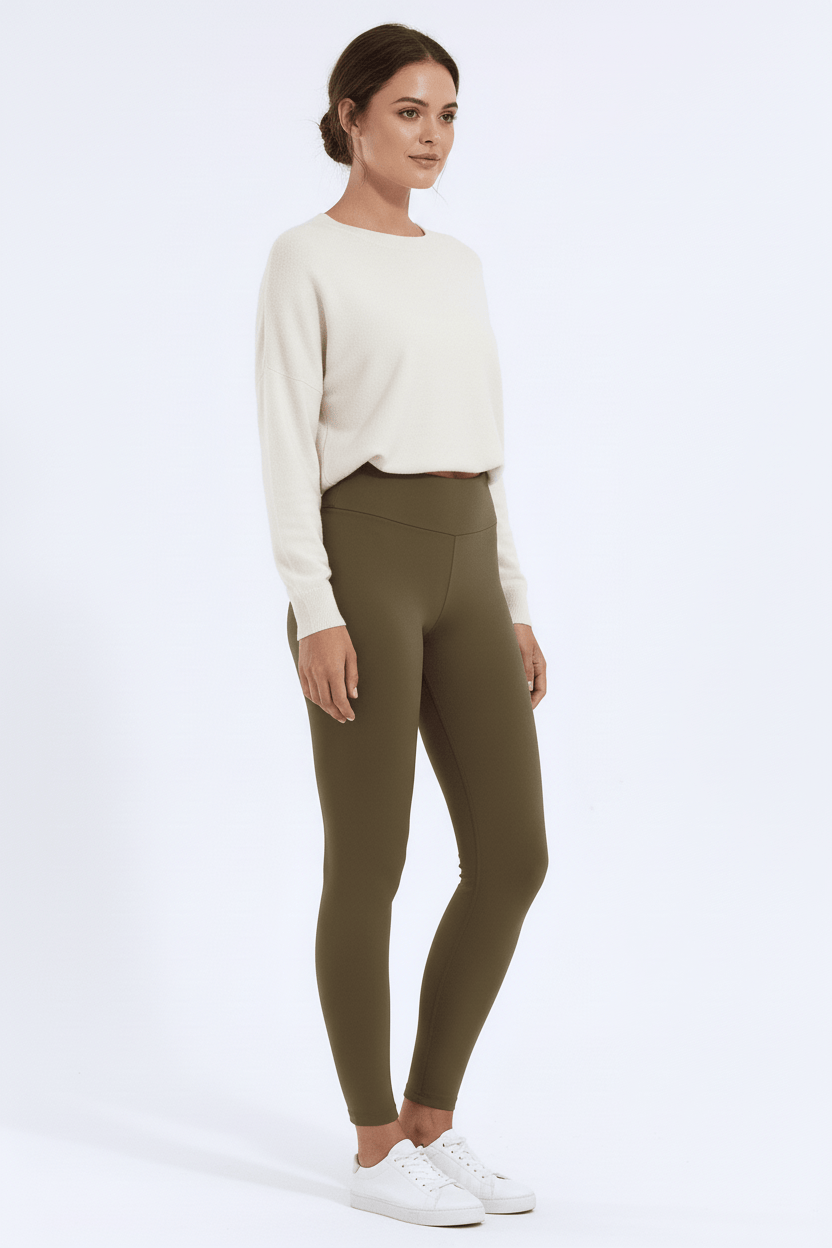 TeddySherpa™ Ultra-Cozy High-Rise Yoga Band Leggings in Cocoa Olive, gentle stretch pose showing comfort H