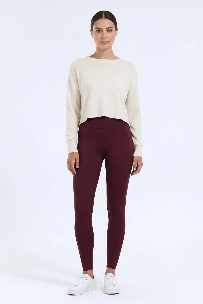 TeddySherpa™ Ultra-Cozy High-Rise Yoga Band Leggings in Maroon, gentle stretch pose showing comfort H