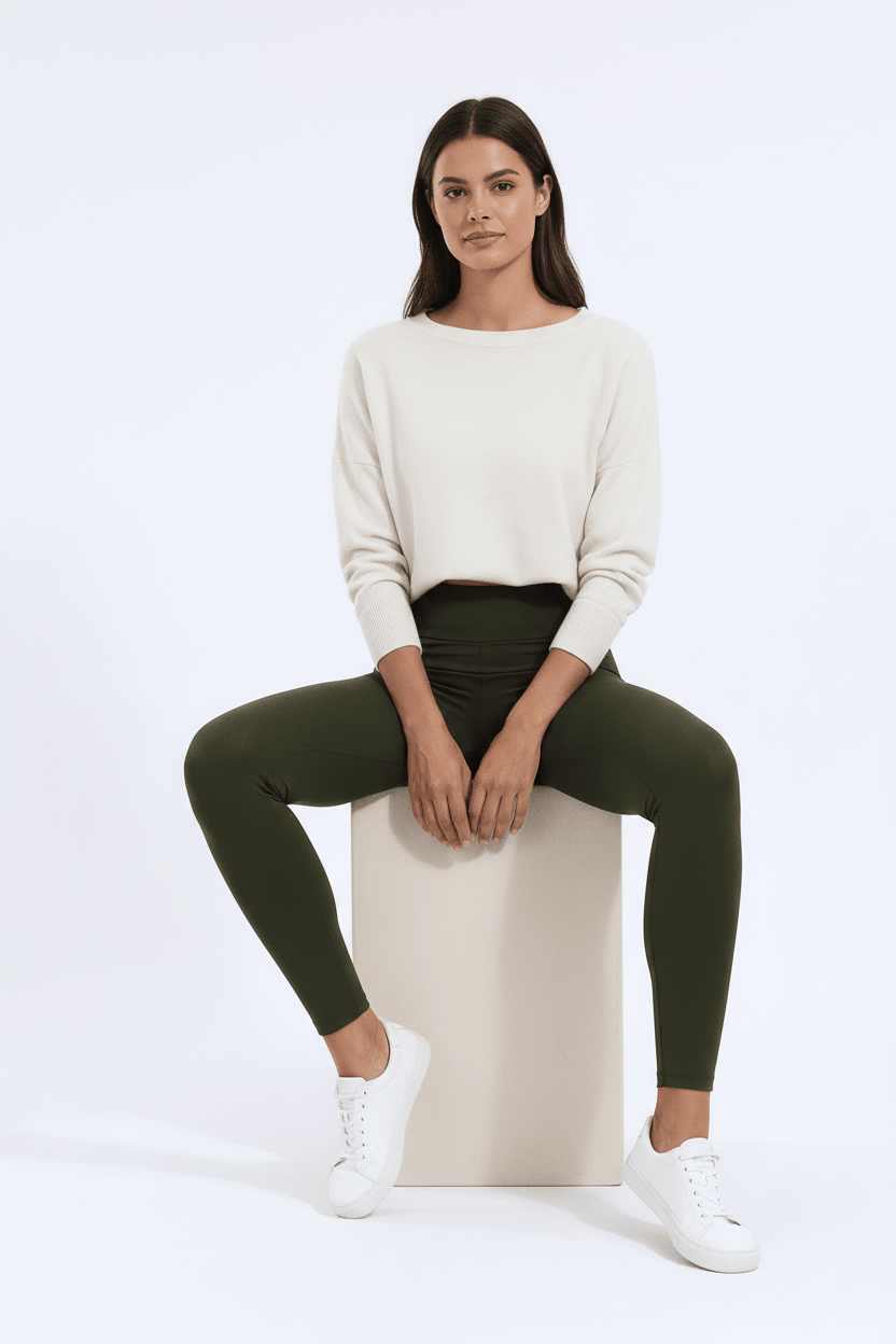 TeddySherpa™ Ultra-Cozy High-Rise Yoga Band Leggings in Cocoa Olive, seated casual pose I