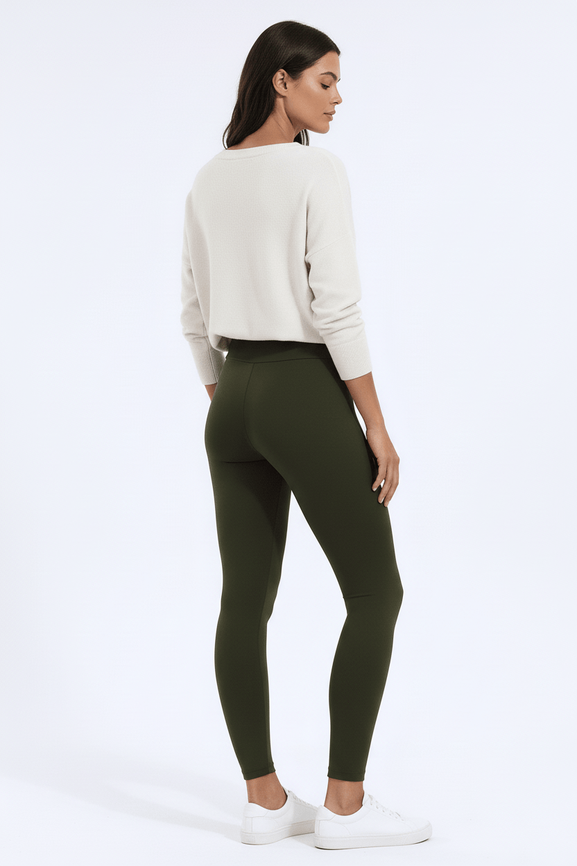 TeddySherpa™ Ultra-Cozy High-Rise Yoga Band Leggings in Cocoa Olive, back 3/4 view, full-length E